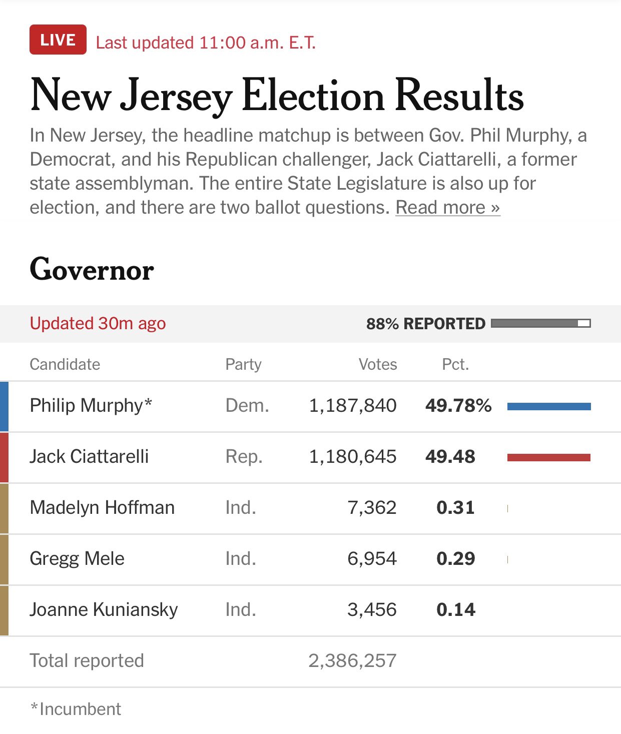 The New York Times has this link to the New Jersey gubernatorial race although the party labels are incorrect. New Jersey and Virginia were the only two states with a gubernatorial election in an off year and all. For faster navigation this Iframe is preloading the Wikiwand page for.